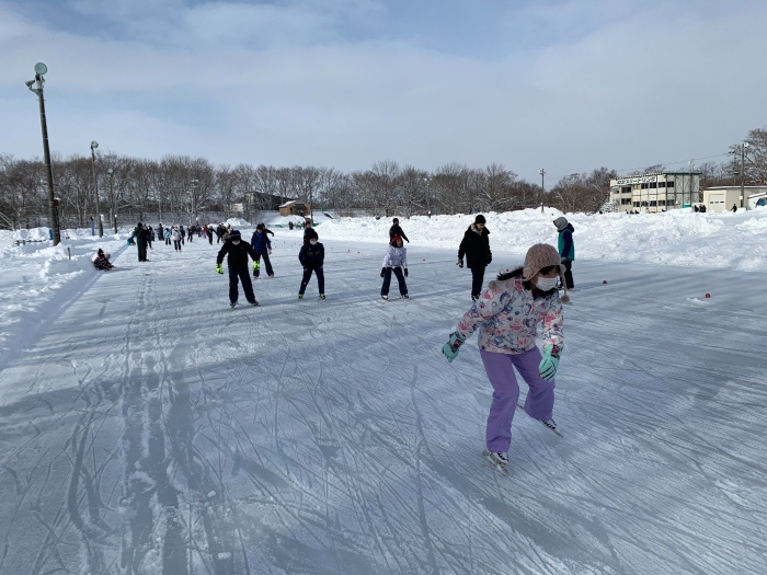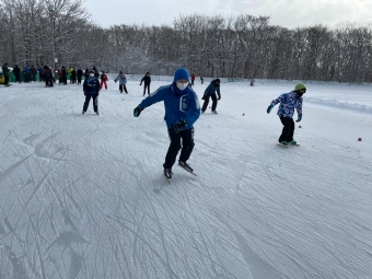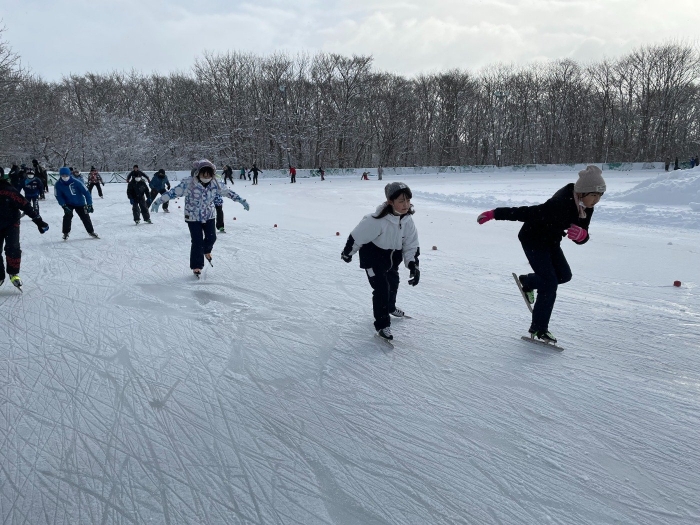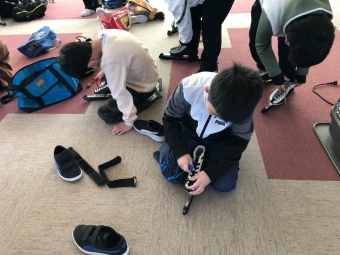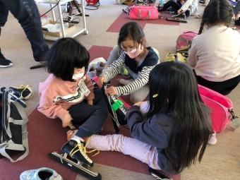 今日は、新春初スケート学習が行われました!2年生、5年生、6年生は町営リンクで、1年生は学校で行いました。1年生は、リンクデビューの前に室内で「スケート靴のはき方講座」からスタート。ひもをきつく締めあげ、リボン結びにするという超難題に果敢に挑んでいました。