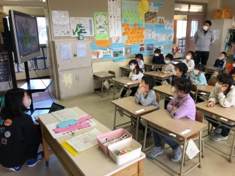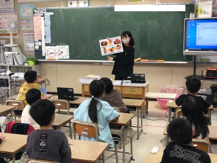 今回は1年生食育の様子を・・・。1年生の食育のテーマは「きゅうしょくのひみつをしろう」。栄養教諭の先生は事前に1年生にアンケートをとり、子どもたちの給食に対する意識を調べていました。そのアンケート結果をもとに、献立表から今日の給食に使われている食材を確かめたり、給食ができるまでの過程がわかる動画を見たりして、「給食のひみつ」を探りました。