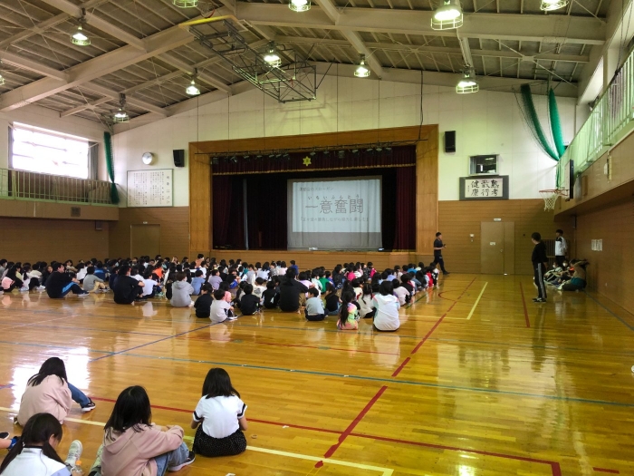 6月15日(土)の運動会に向けての取り組みが本格的に始まりました。先週の昼集会では児童会から運動会スローガンの発表がありました。今年度のスローガンは「一意奮闘」~正々堂々勝負して、協力して楽しもう~になりました。