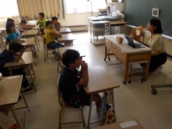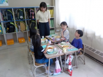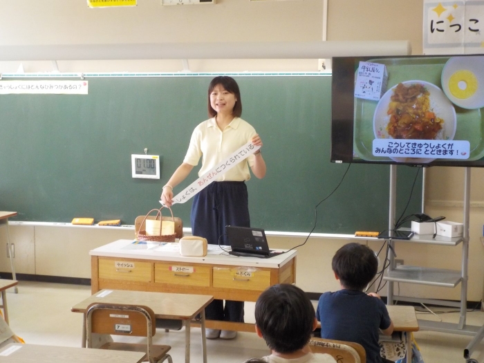 今回は1年生の教室で栄養教諭の先生が食育の授業を行いました。テーマは「きゅうしょくにはどんなひみつがあるの?」