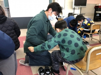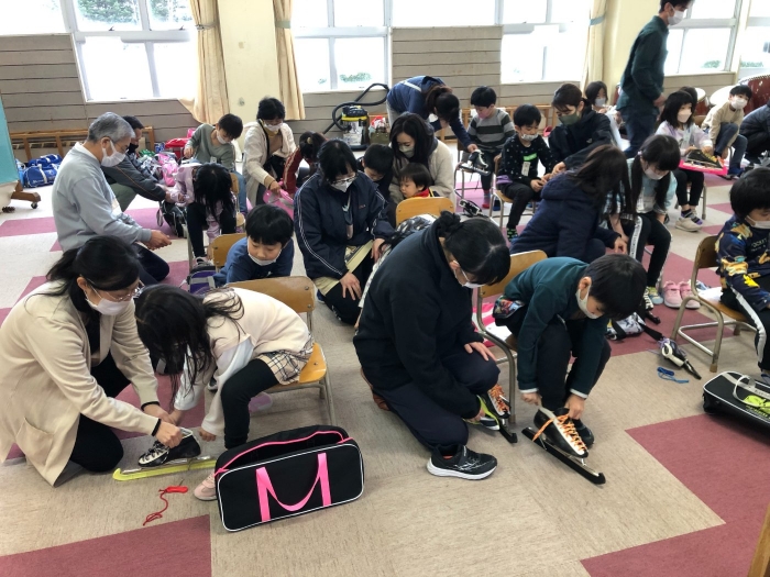 冬休み明けから、体育でスケート学習が始まります。授業が始まる前に、冬休みにいっぱい滑って、スケートに親しんでほしいと思っています。1年生が先駆けて、「スケート靴ひも結び講習会」を行いました。1年生にとって、寒いなか足が安定するように靴紐をぎゅっと締めて、更にちょうちょ結びにするのは、かなり難易度の高い作業です。しかし、氷にうまく立ってスケートに乗れるようになるのには、靴紐をいかにぎゅっと締めることができているかにかかっている・・・といっても過言ではありません。