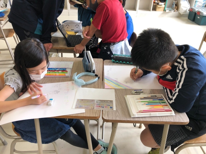 さて、「祭り」に向けて準備が始まりました。10月4日に5,6年生たちが集まり、先行して、大まかなコンセプトや役割等について話し合っておきました。今日の全校での準備では、5,6年生が「出店のねらい」「活動内容」などを4年生以下に伝え、「ちらし作り」や「ポスター作り」、「看板作り」などの準備を進めました。高学年が低学年に、丁寧に作業内容を伝えたり、作業をサポートする姿があちらこちらで見られました。