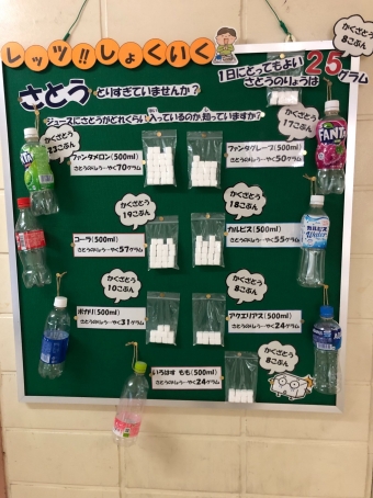 ☆別海中央小学校☆食育コーナー 2023年10月17日(火) 日々のできごと 廊下の掲示板に「食育コーナー」があります。栄養教諭が時々掲示物で情報を発信してくれます。 今月のテーマは「砂糖、とりすぎていませんか?」。様々な飲み物に含まれている砂糖の量を角砂糖の実物で表しています。 子どもたちは、興味津々・・・「え?こんなに砂糖が含まれているの?」驚きの表情で掲示物を見ています。