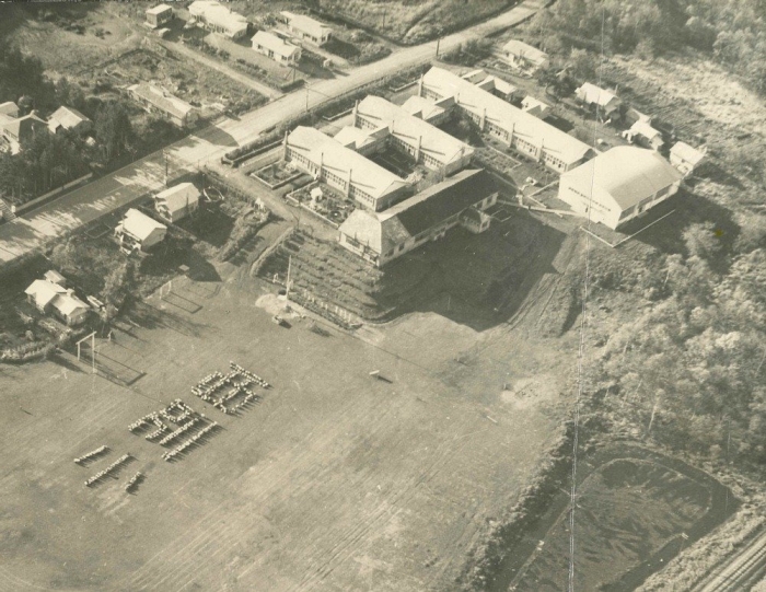 西別小学校 西別原野35線に新築移転した校舎と、その後増築した校舎が混在している(1964年撮影)