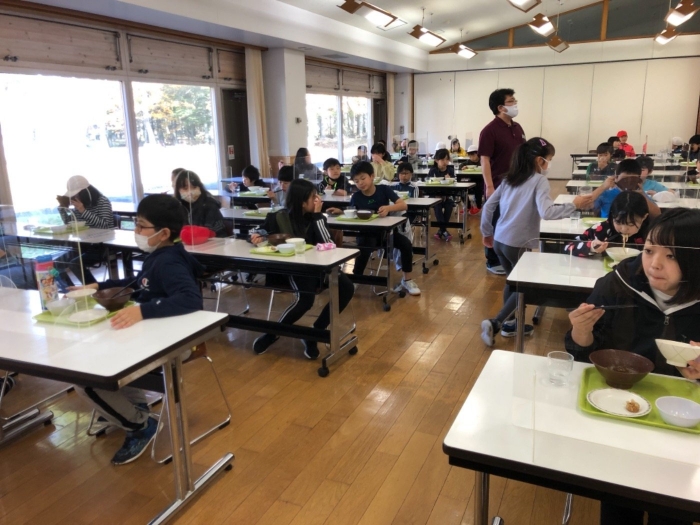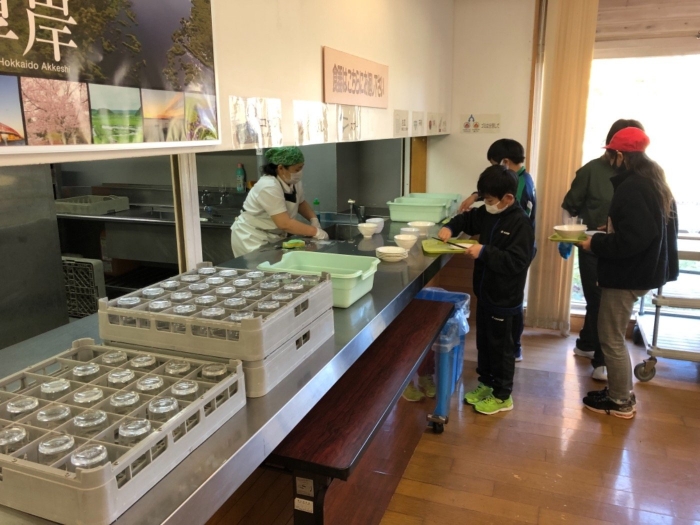 ☆別海中央小学校☆5年生宿泊学習13 2021年10月28日(木) 終わりが近づいてきました。美味しくお昼ご飯をいただきました。食べ終わった人から食器やトレーを厨房の方へ戻します。その時、厨房の中にいらっしゃるお仕事をされている方に、「美味しかったです!」「ご馳走さまでした!」と声をかけながら通る子どもたち。感謝を言葉で表せること、大事です。
