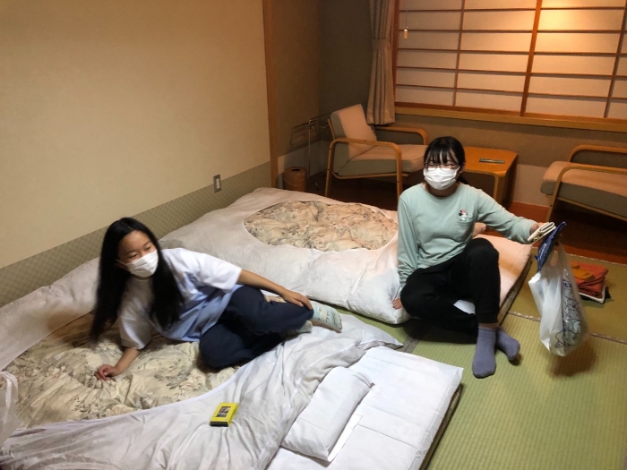 就寝前の検温をしにお部屋訪問。歯を磨いたり、お布団を整えたり、明日から服を枕元にセッティングしたり…。何故かこの期に及んでおやつを食べている人も。