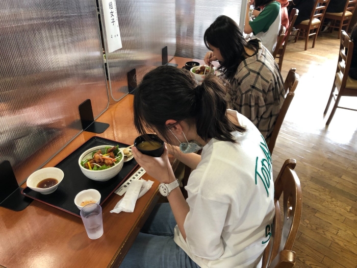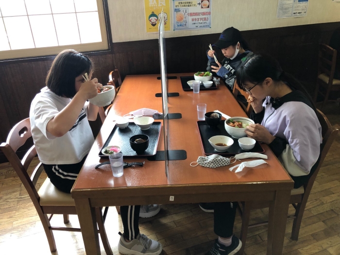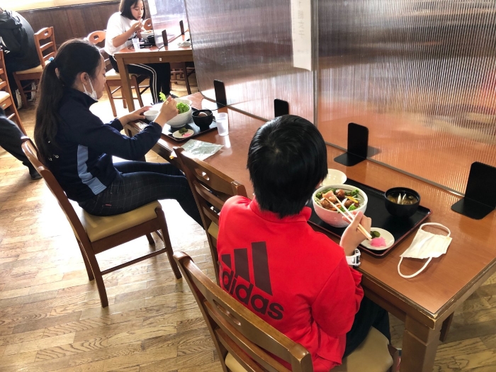 午前の活動を終えて昼食会場のオホーツクバザールで、1組、2組合流。お腹がすいたようで、モリモリ食べています。