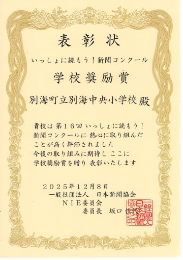 ☆別海中央小学校☆いっしょに読もう!新聞コンクール学校奨励賞