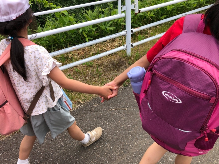 開会式を玄関前で行ったあと、目的地に向かって元気に「いってきます!」高学年と低学年がペアになって交通安全に気をつけて歩きます。道を渡って歩道のサイドが変わったら、ちゃんと車道側に高学年がくるようにチェンジしていました。
