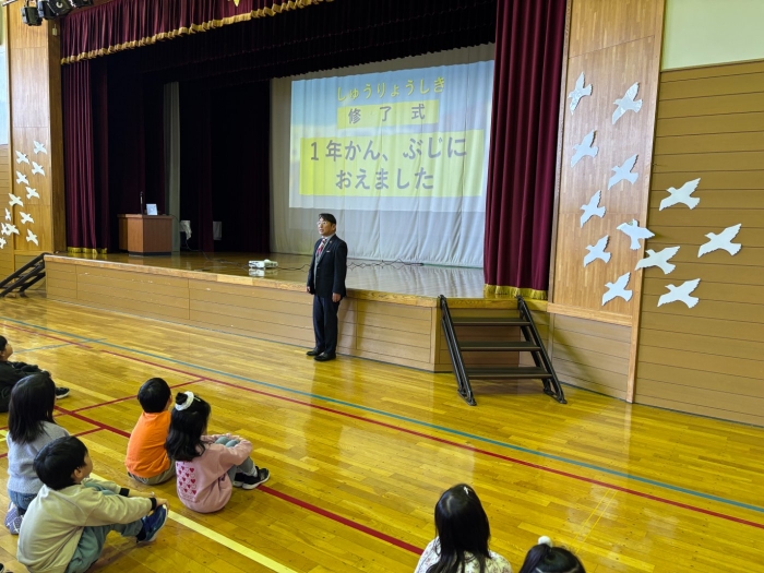 令和6年度の修了式、離任式が行われました。各学年の代表児童一人ひとりに校長先生から修了証が手渡されました。どの児童も、よい声、よい姿勢、よい笑顔で修了証を受け取ることができました。