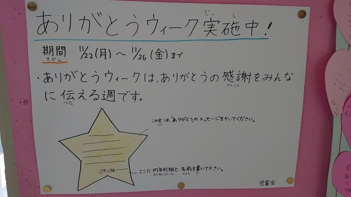 ☆別海中央小学校☆児童会の企画です。 2021年11月30日(火) その他 児童会が「ありがとうウィーク」を実施しました。 写真に写っていますが、中央っ子が「ありがとう」の感謝の気持ちを紙に書き、伝える企画です。 たくさんの中央っ子が感謝の気持ちを書いていたので、ブログでも紹介させて頂きます。今週の参観日にも掲示されていますので、来校された際には、ぜひご覧になってください。