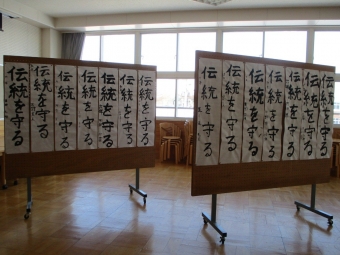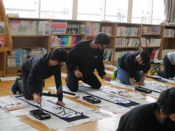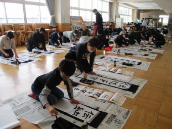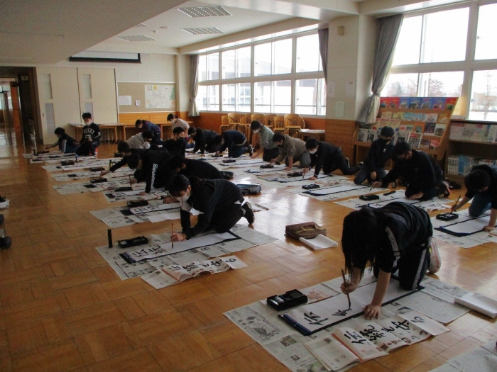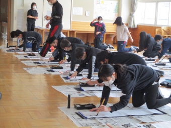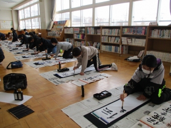 ★上西春別小学校★6年生♬書初めに挑戦! 2022年01月25日(火) 授業の様子 書初めは書の上達を願ったり、新年の抱負を新たにしたりする意味で行われる日本の伝統行事です。一般には1月2日に行われることが多いようです。 学校の書写の教科書にも「書初めをしよう」という教材があります。1月2日からは少し日が開いてしまいましたが、新学期が始まった1月に・・ということで、昨日の書写の時間に6年生が挑戦していました。 教室前の広いワークスペースにいつもより大きい半紙を広げ、しっかりした太い字で書くことができるよう、取り組んでいました。