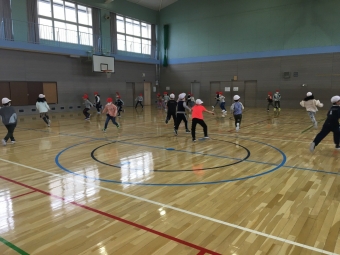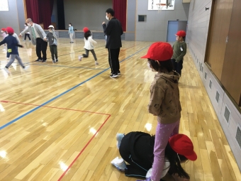 学校探検の最後は、体育館で交流しました。1年生と2年生一緒に鬼ごっこなどで楽しみました。