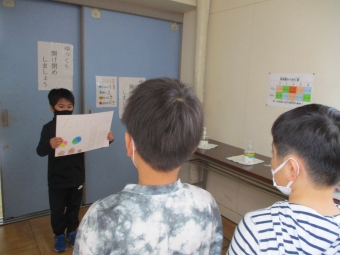 2年生が「ここに立って『しつれいします。』って言います。」と教えています。
