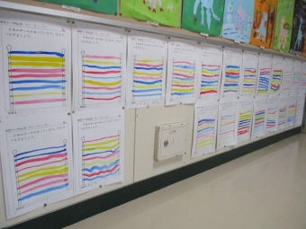 パレットや筆洗の使い方を習ってから、早速絵の具を溶いて画用紙に描いてみます。はじめは長い線を引けるくらいのちょうどよい水の量を覚えます。好きな色のなめらかな線を引いていきます。