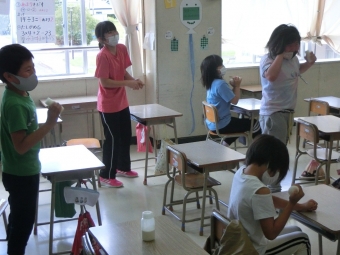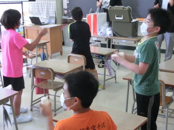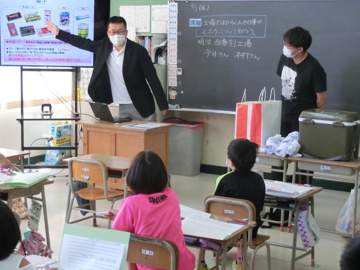 ★上西春別小学校★出前授業がありました。 2021年09月03日(金) 授業の様子 今週、3年生の社会科で出前授業を行って頂きました。 講師は明治乳業西春別工場の方です。 工場で働く人と仕事の工夫について、お話をしていただき、質問にもたくさん答えて頂きました。 後半は、バター作り体験もしました。 講師の皆様、貴重な機会をありがとうございました! バター作りをしています。 振って!振って!!
