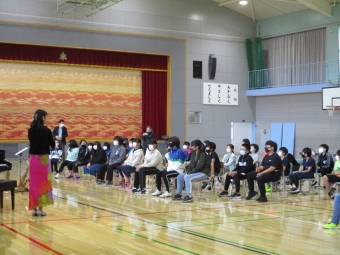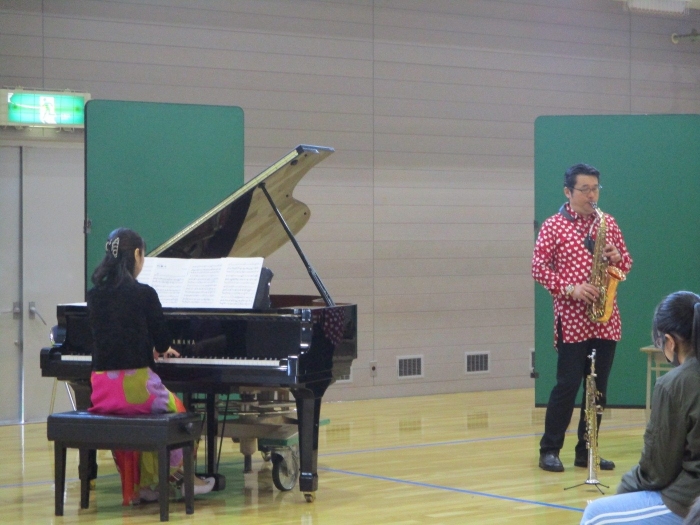 ★上西春別小学校★芸術の秋♫ 2021年09月17日(金) 授業の様子 今日は、北海道青少年芸術劇場「サクソフォンとピアノのコンサート」が本校の体育館を会場に行われました。 プロのサクソフォン奏者中村氏とピアニスト西上氏による演奏を、5年生と6年生が楽しみました。 体育館が音楽ホールに早変わり。楽器の紹介をしていただいたり、子ども達におなじみの曲や名曲の数々を演奏していただいたりしました。 芸術の秋を堪能した一日でした。 ありがとうございました。