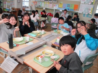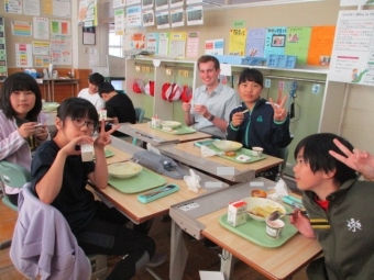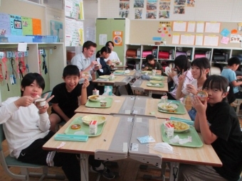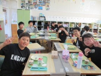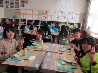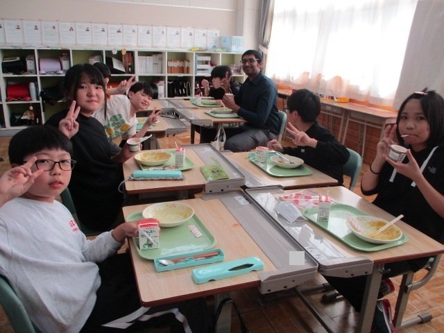 写真は、ALTのエレク先生、クレヴィ先生と一緒に給食をとっていた5・6年生のおいしい顔をご紹介。