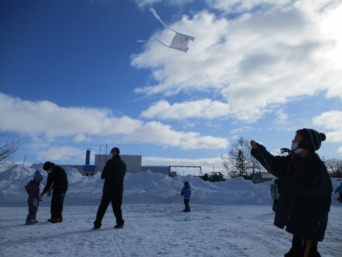 雪の上を走ったり、時折吹くちょうどよい強さの風にのせたりして、思い思いに凧あげを楽しんでいました。