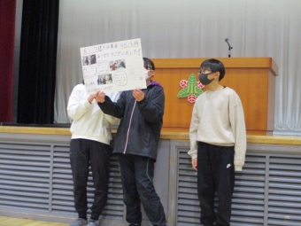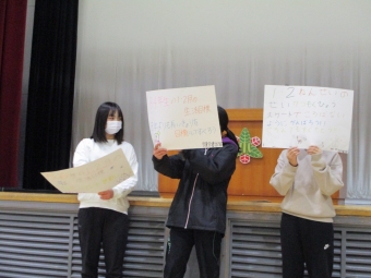 児童会書記局から、生活目標の発表と、赤い羽根共同募金の結果のお知らせとお礼がありました。