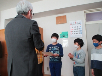 上西春別中学校区CS委員会の三行詩コンクールで入賞した皆さんに、校長先生から賞状と記念品を伝達しました。校長先生から、賞状に載せられた素敵な三行詩も読んでもらって、笑顔で受け取っていました。