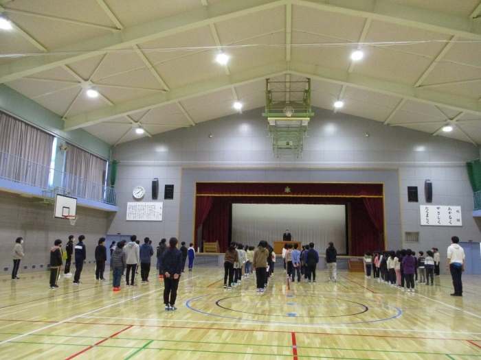 感染予防のため、今週からは分散による実施に切り替え、今日は2・4・6年生が体育館に集まりました。