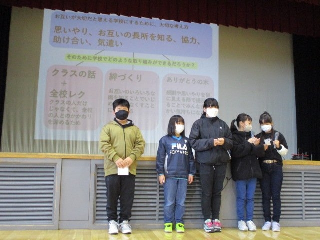 どさんこ子ども会議に参加した5年生は、会議で他校の児童生徒と話し合ったことをもとに、上西小で今取り組んでいることとの関係を紹介し、これから取り組んでいきたいことについてみんなに呼びかけてくれました。