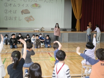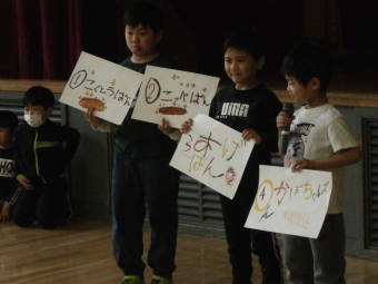 6年生は楽しいクイズ。1年生が夢中で答えていました。