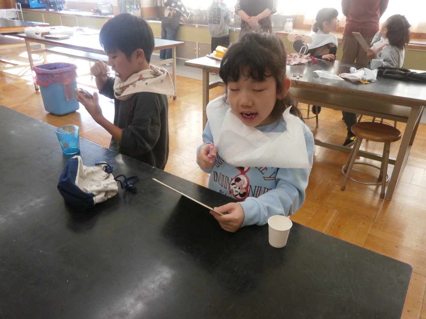 歯科衛生士さんをお招きし、歯科指導が行われました。乳歯と永久歯の違いや虫歯の症状の例、歯周病などについて知り、歯を守るための歯磨きの仕方を学びました。鏡を見ながら丁寧に歯を磨く子ども達。虫歯にならないように、自分の歯を守るために、これからもしっかりと歯磨きを続けていきたいと思える1時間でした。ありがとうございました。