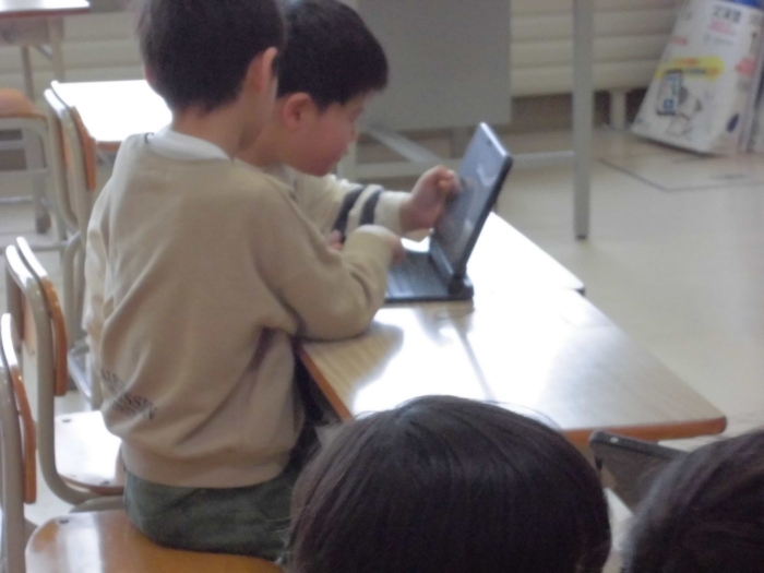 2年生が学習用タブレットの使い方を1年生に教えていました。