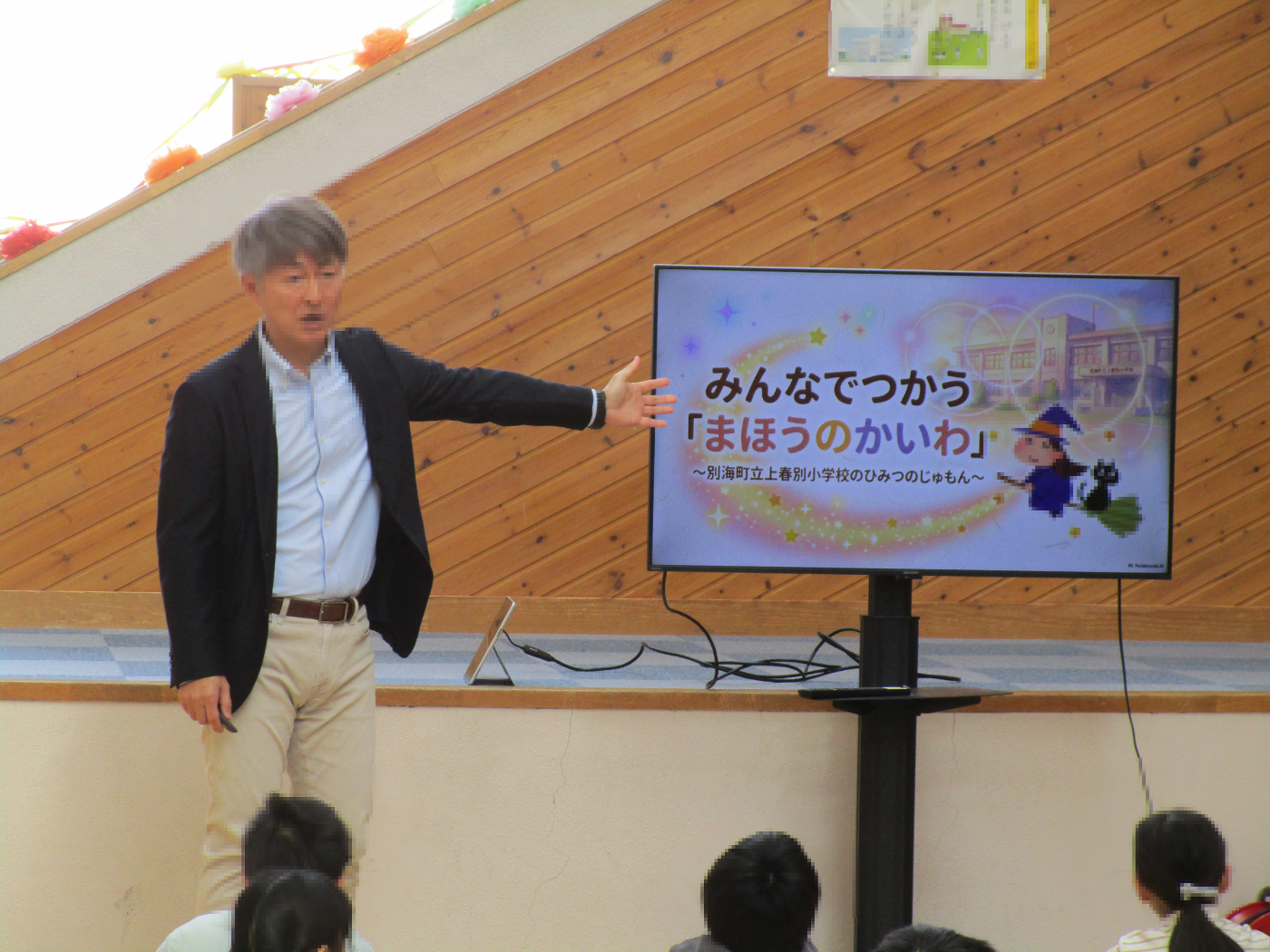 本日、校長より講話があり、上春別小学校の合言葉「まほうのかいわ」について、子どもたちにお話をしました。