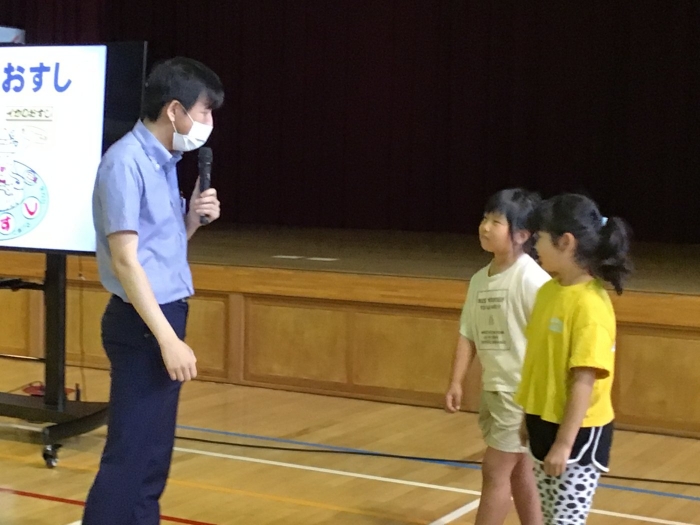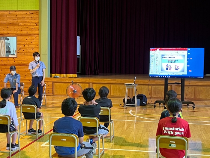 👮♂️防犯教室👮♂️ 2023年07月14日(金) 行事 7月13日(木) 2時間目に防犯教室を行いました。 夏休みに遊んでいるときに, 知らない人に声をかけられたら・・・ そんな場面を想定して,実践練習を行いました。 中標津警察署と上春別駐在所から警察の方が来て,ご協力くださいました 知らない人に声をかけられています。この後、二人は全速力で逃げました!合格です! 参加した児童は「怖かった・・・」と言っていました。 実際に声をかけられたら, 緊張して,怖くて,声が出なくなります。 危険だなと思ったら,すぐに逃げることが大切です。 そして近くの大人に助けを求めることを学びました。 『いかのおすし』です! ※写真の転用を禁止します