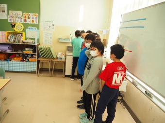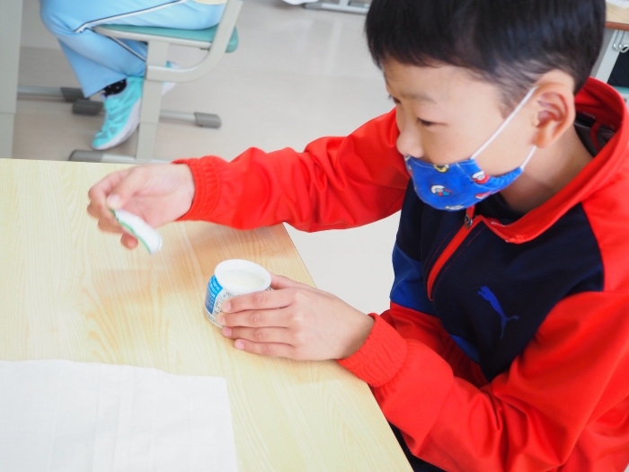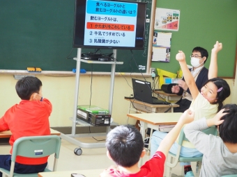 その後、クイズなどを交えながら、働く人が気を付けている事や、おいしい牛乳を作る工夫、牛乳がみんなのところに届くまでを学び、飲むヨーグルトづくりを体験しました。