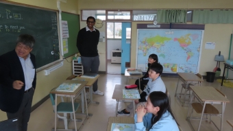 今日はALTのクレヴィ先生がくる日です。今年度最初の外国語活動・英語の学びを行いました。