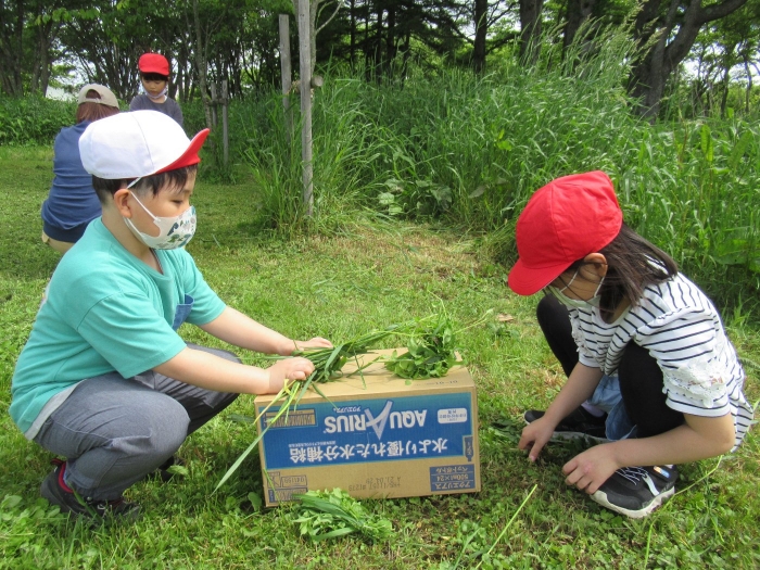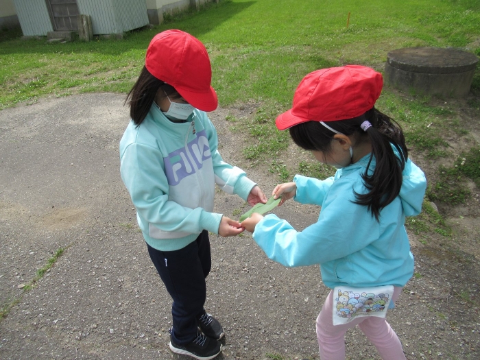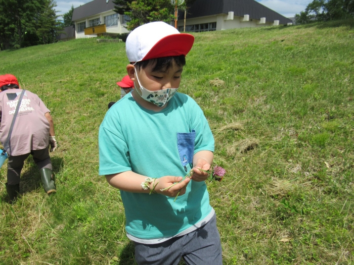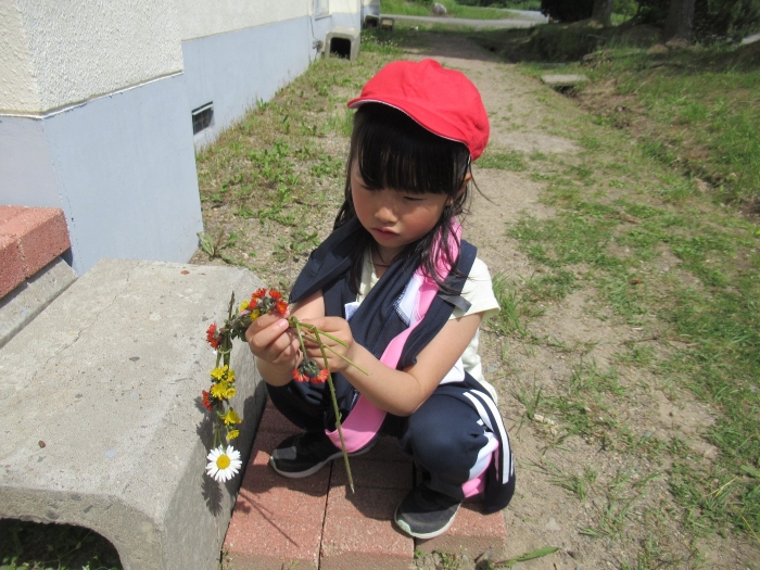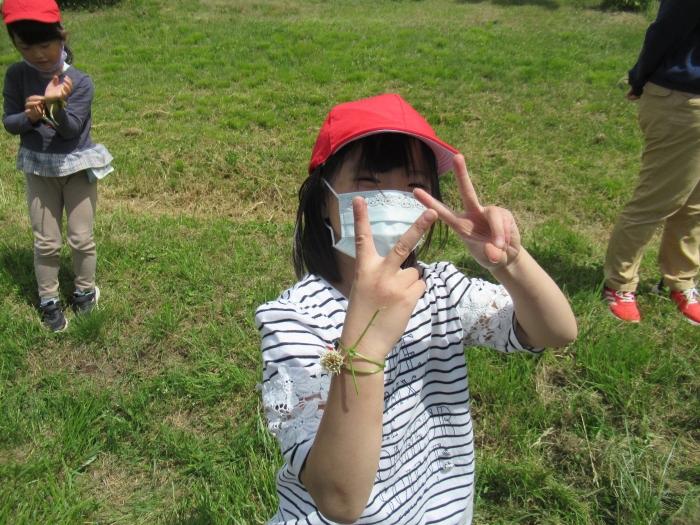 1年生、草花遊びを行いました。野の花を使っていろいろな遊びを行いました。