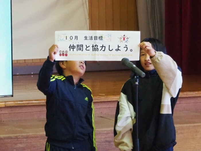 委員会からは今月の生活目標が発表されました。今月は「仲間と協力しよう」です。もうすぐ学芸会もありますので、みんなで協力して思い出に残る学芸会を作り上げてほしいと思います。