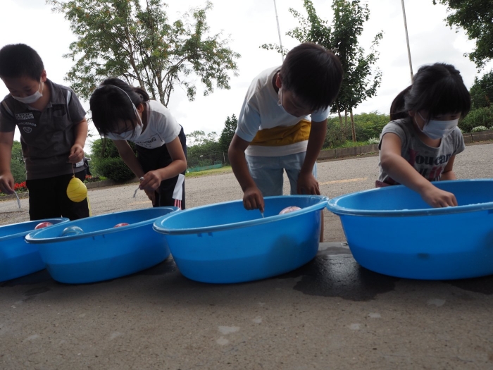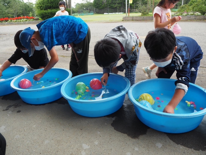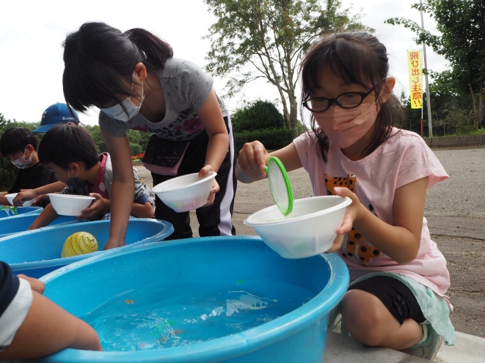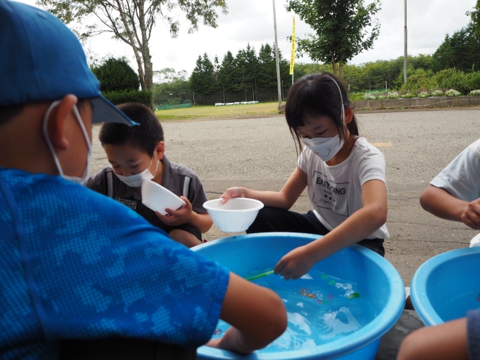 【上風連小学校】夏祭り 2022年08月26日(金) #1.2年生 1.2年生の生活の時間にヨーヨー釣り、金魚すくいをしました。 1年生は「なつとなかよし」、2年生は「なつをたのしむくふうはどこ」という学習になります。 体験してきた夏という季節と行事の関係を感じ、遊びの面白さや不思議さに気付き、みんなで楽しみながら生活を楽しくしようとするねらいがあります。 地域や町のお祭りやイベントが中止になり、夏の行事に触れる機会が少なかった児童もいたようですが、今回の学習を通じて、友だちと関わりながら、楽しく活動することができたようです。