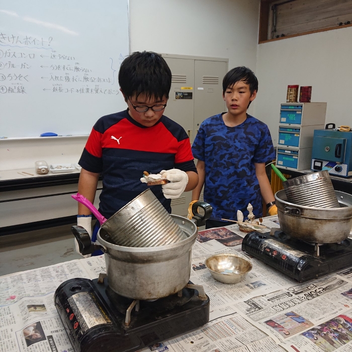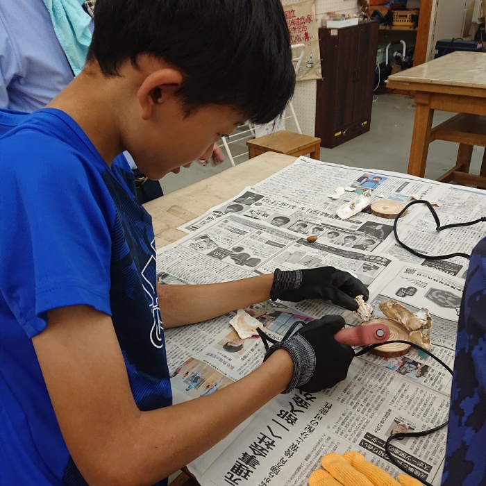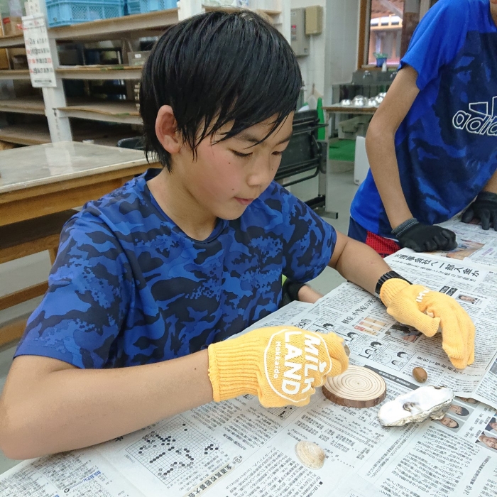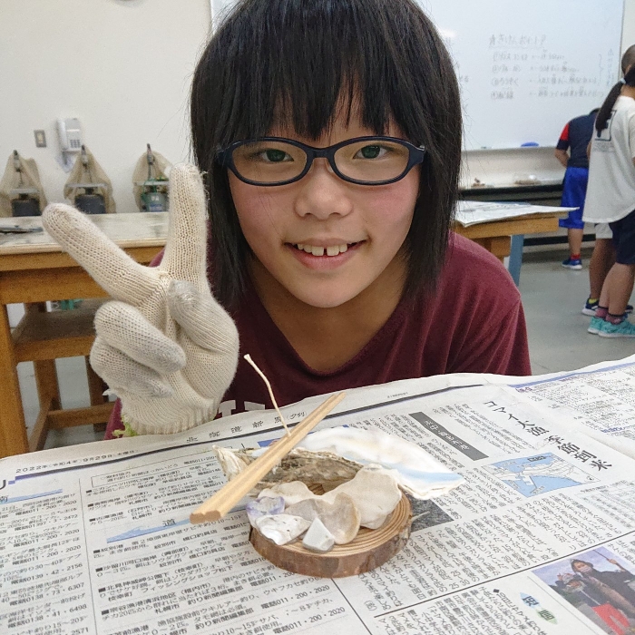 牡蠣の貝殻を使ってキャンドルを作りました。松ぼっくりや貝で飾りつけをしました。とても楽しんでいました。