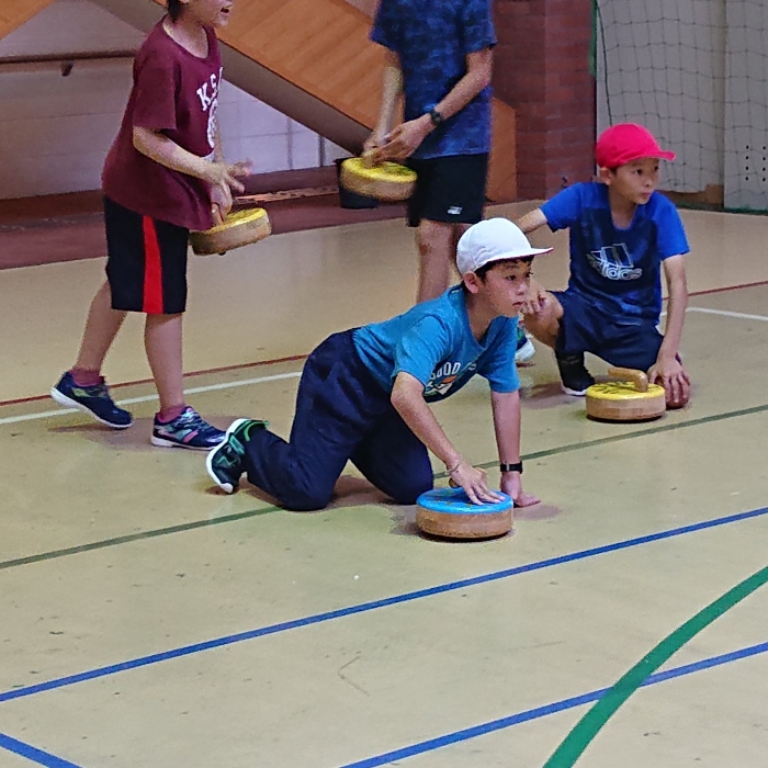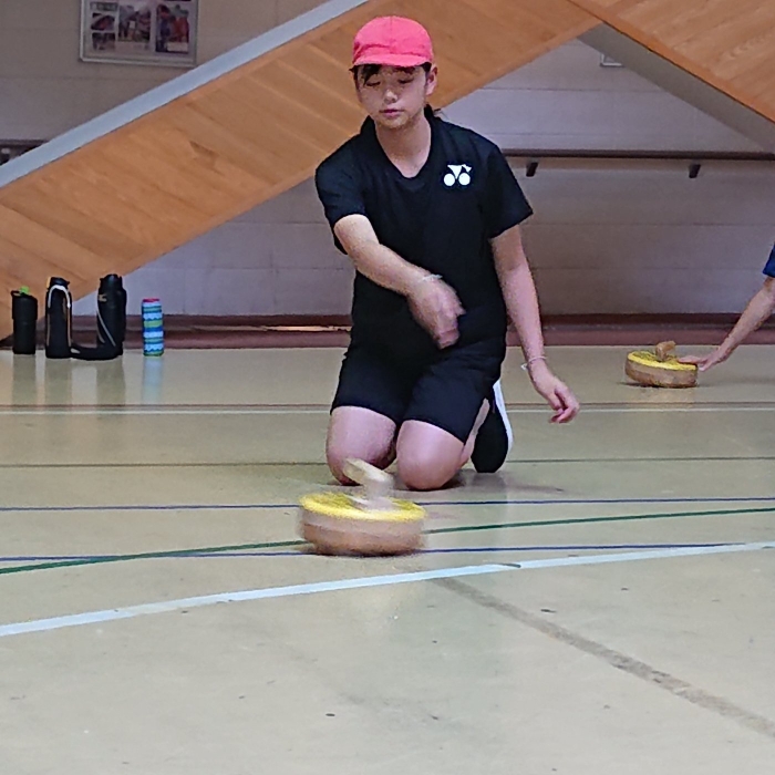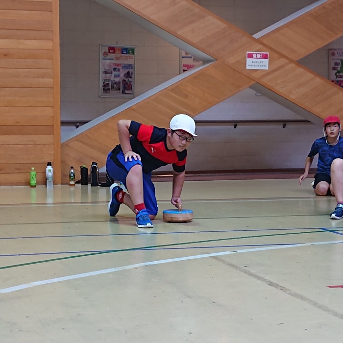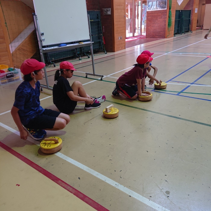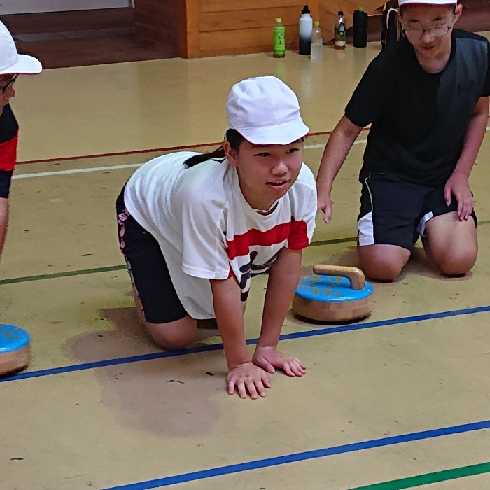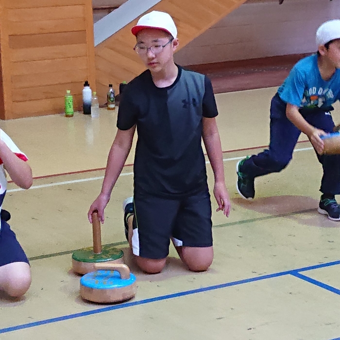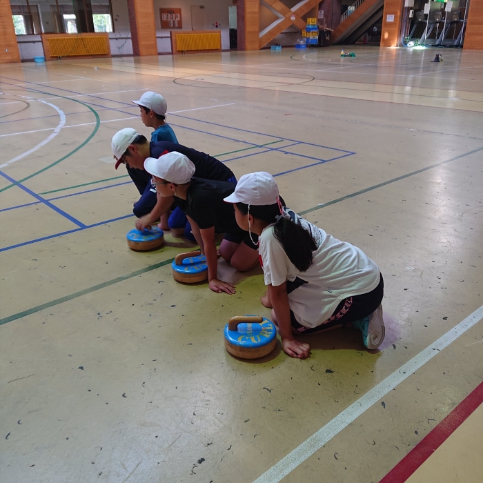 フロアカーリング。初めてやった子どもたち。だんだんうまくなってきました。