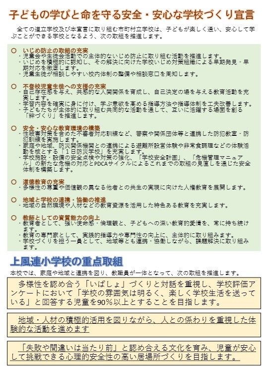 子どもの学びと命を守る安全・安心な学校づくり宣言について 2026年04月22日(水) NEW お知らせ 本校では、「子どもの学びと命を守る安全・安心な学校づくり宣言」に基づき、いじめ防止や不登校支援をはじめ、子どもたちが安心して学べる温かな環境づくりを進めていきます。 今後も、家庭や地域の皆様と協力しながら、子どもたちの健やかな成長と安全を守ってまいりますので、ご理解とご協力をよろしくお願いいたします。