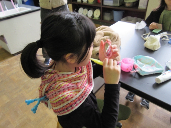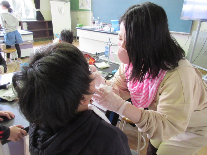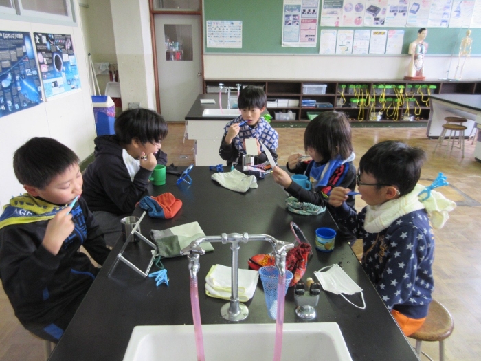 3年生と4年生は赤染め液を使った歯みがき指導です。ブラッシング圧や歯垢の正体など、探究心旺盛な3・4年生にぴったりの説明でやる気もアップ!歯みがき名人続出!歯がピッカピカになりました。