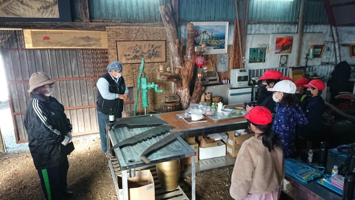 4年生は社会科「昔から今へ」の学習で、中西別の歴史を調べています。今日は、地域の貴重な資料を保管し、地域の文化の拠点となっているイエローハウスを訪ね、開拓から現在までの中西別の歴史と暮らしの変化について教えていただきました。昭和初期からの実際に使用していた農作業道具や機械、生活用品を見せていただいた後、開拓当時から昭和の時代の貴重な記録画像を見ながら酪農の町として発展してきた今につながる中西別の物語を聞きました。
