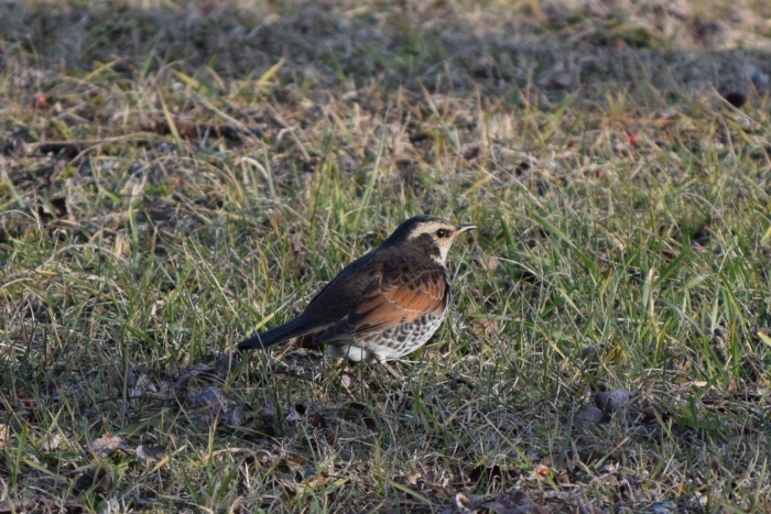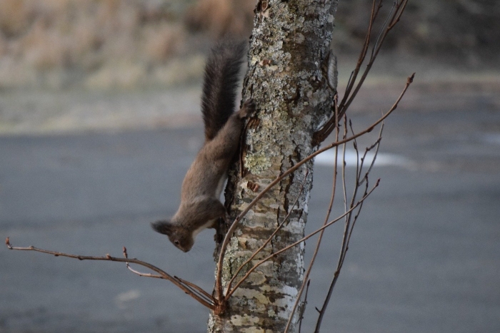 今日はツグミがグラウンドに歩いてきました。リスは元気に木登りをしていました。
