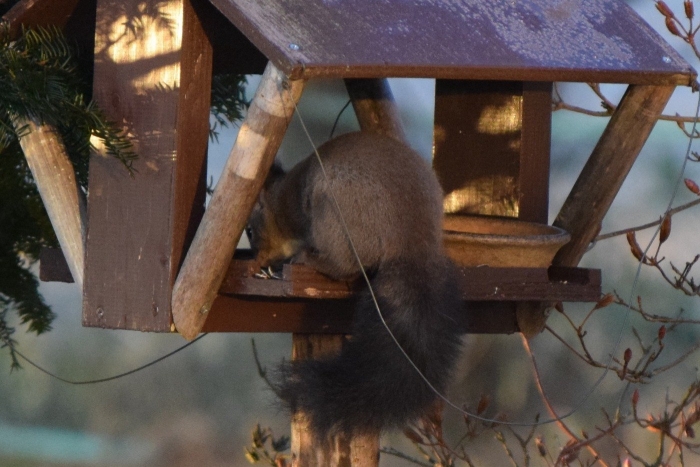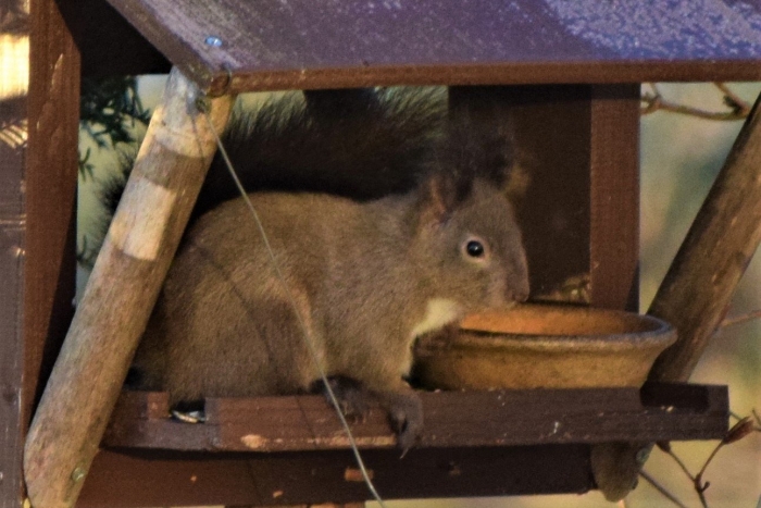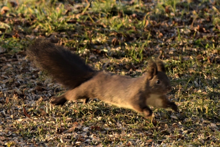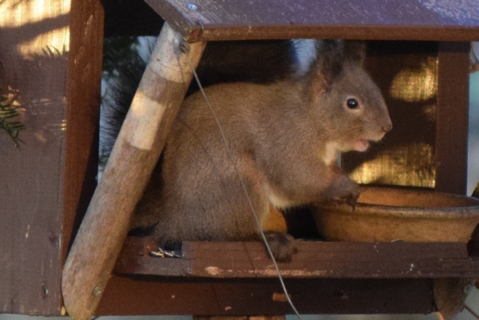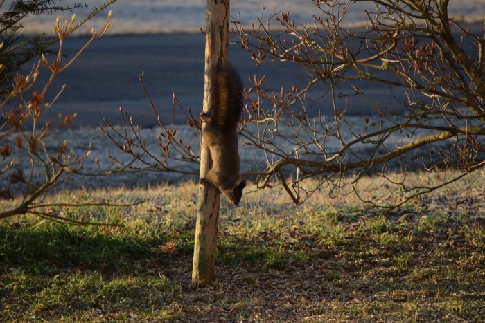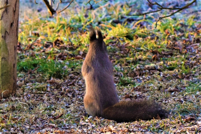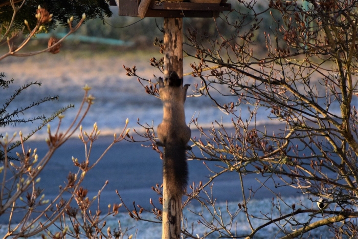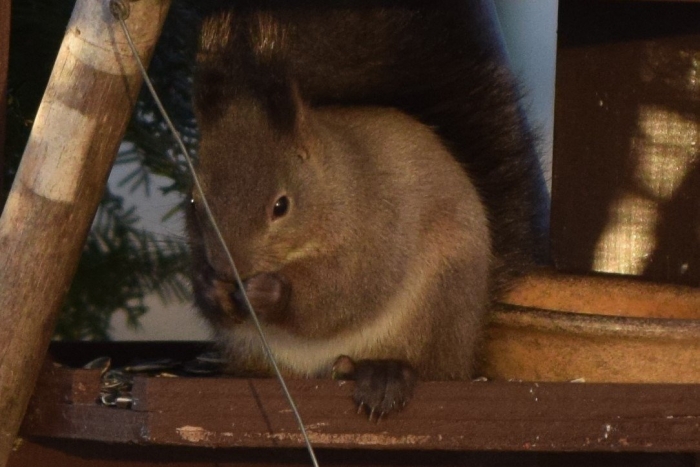 朝日をあびて「いいしせい」でエゾリスが座っています!