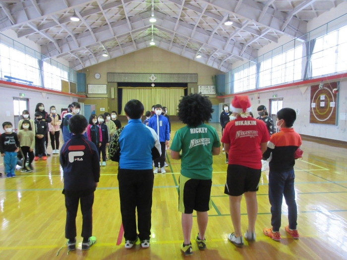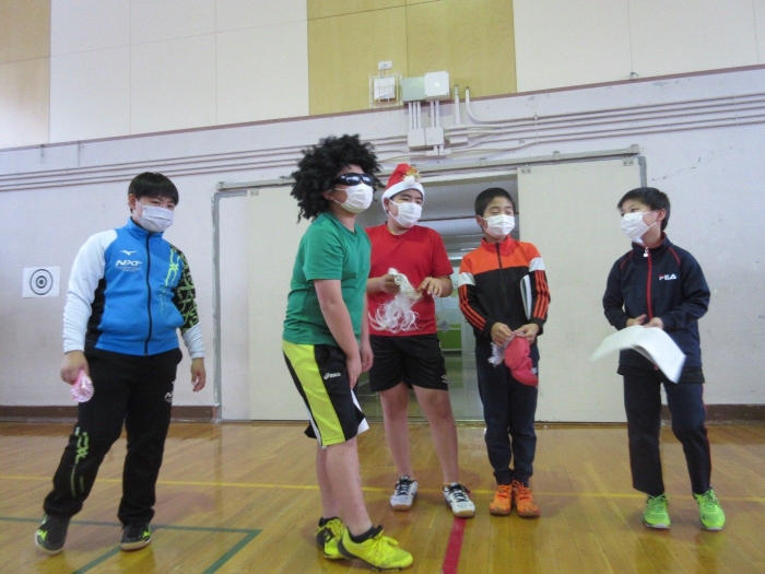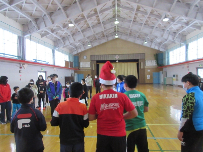 中西っ子は一旦体育館に集まり、校内のどこかに隠れている3人のサンタを探します。
