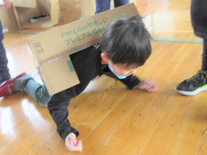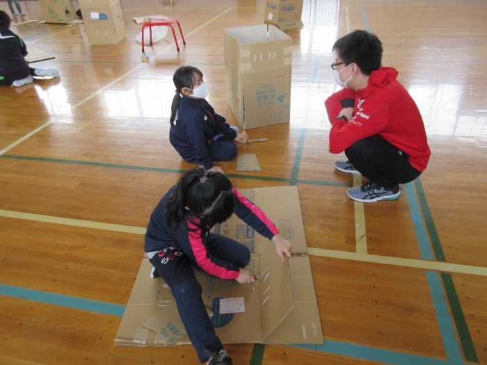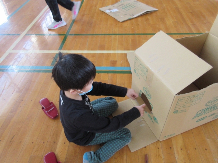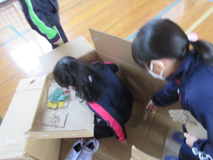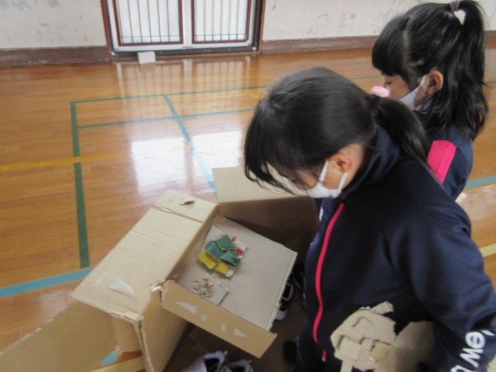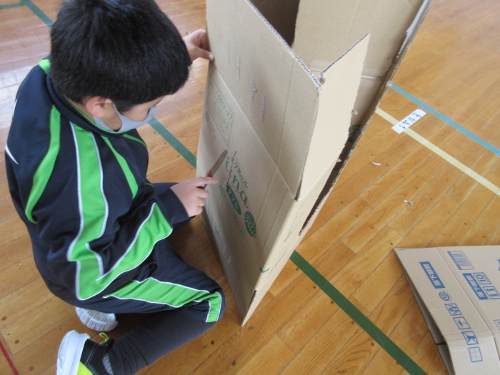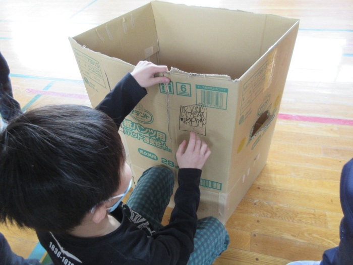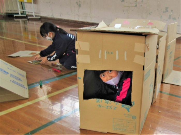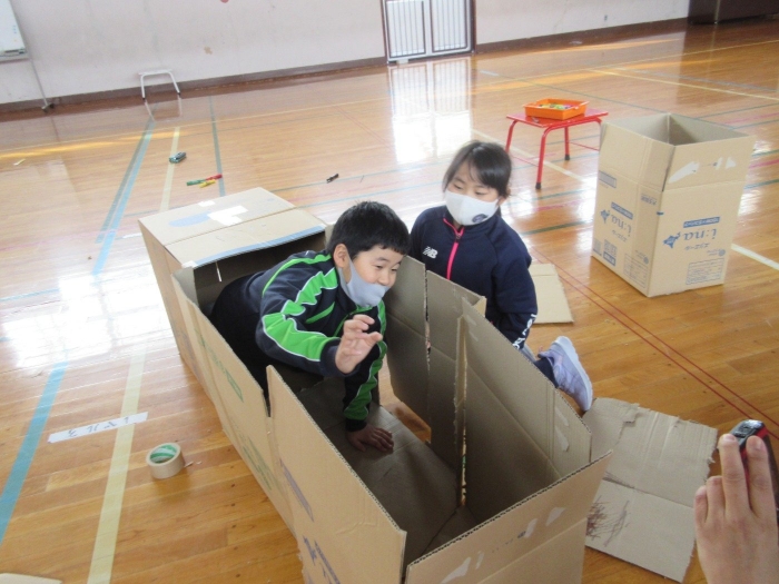 2年生の図工は「だんボールにはいってみると」。大きなだんボールを何個も使う大がかりな創作活動です。アイデアいっぱいの楽しい作品が生まれました!
