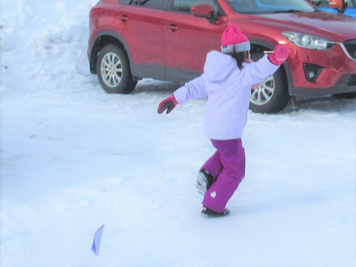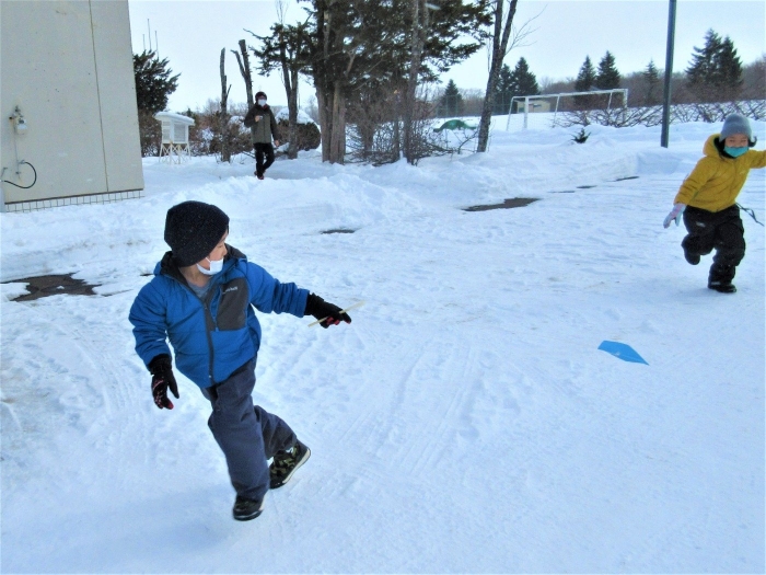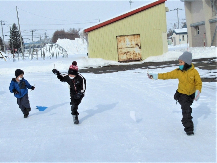 1年生は図工で凧を作ってあげてみました。寒かったけど風があったから、微妙にあがった・・(かな?)