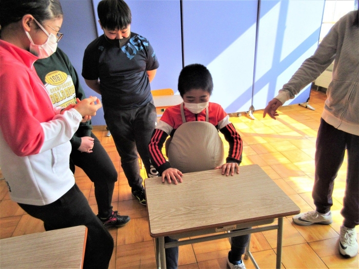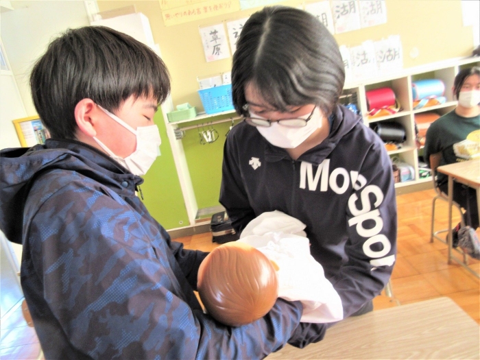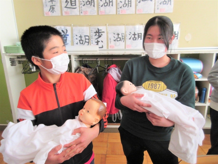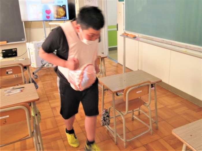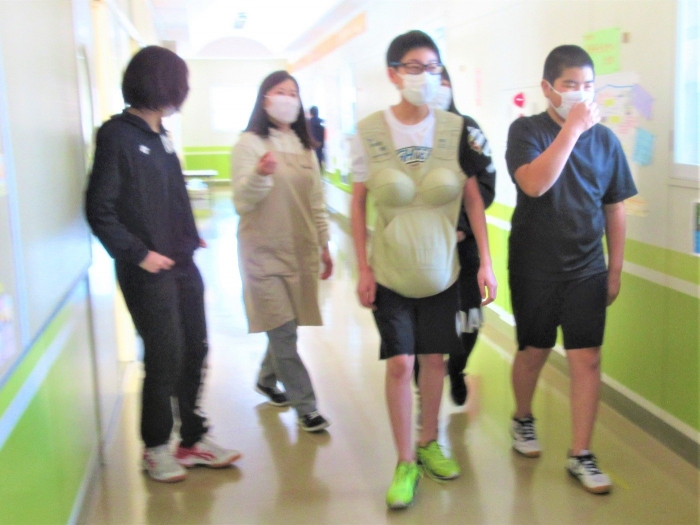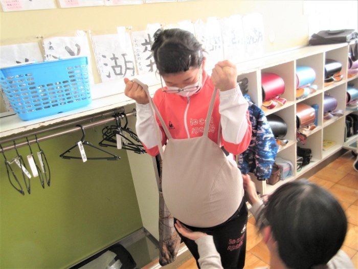 保健センターからお借りした教材でを着用し、妊婦体験もしてみました。「重いなあ・・。」「歩きづらい・・」「座るのも大変だね・・」「お母さん、お腹が大きくなってからも牛舎で仕事してたよ・・」