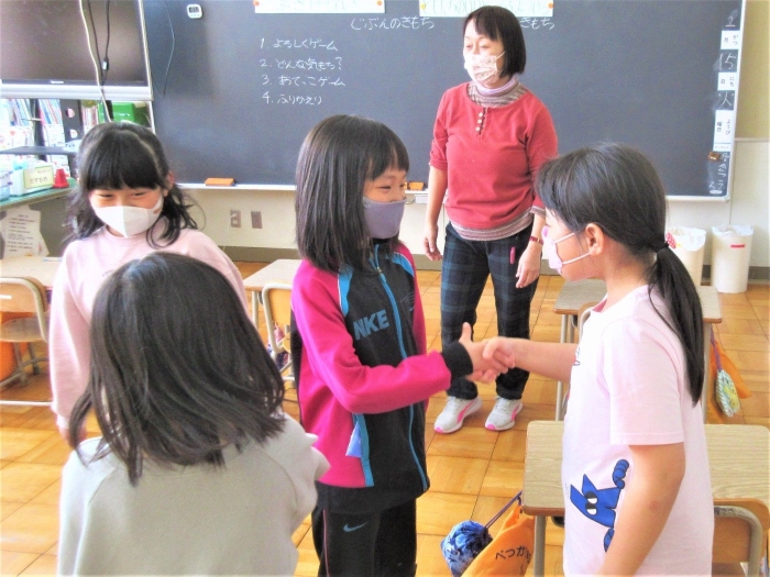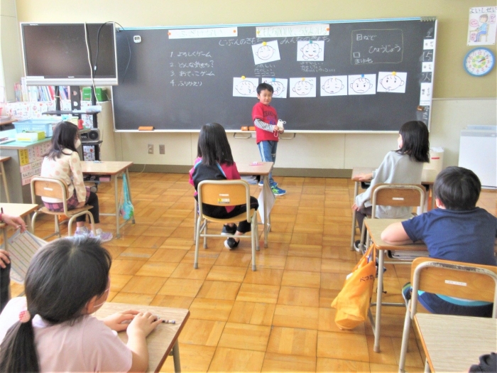 1・2年生は人間関係スキルアップ授業をしました。今日は「自分のきもち、みんなのきもち」の学習です。「よろしくゲーム」を通して、目や表情が気持ちを伝えることを発見した子ども達は、「あてっこゲーム」をしながら、表情から友達の気持ちを察するスキルをアップをしました。