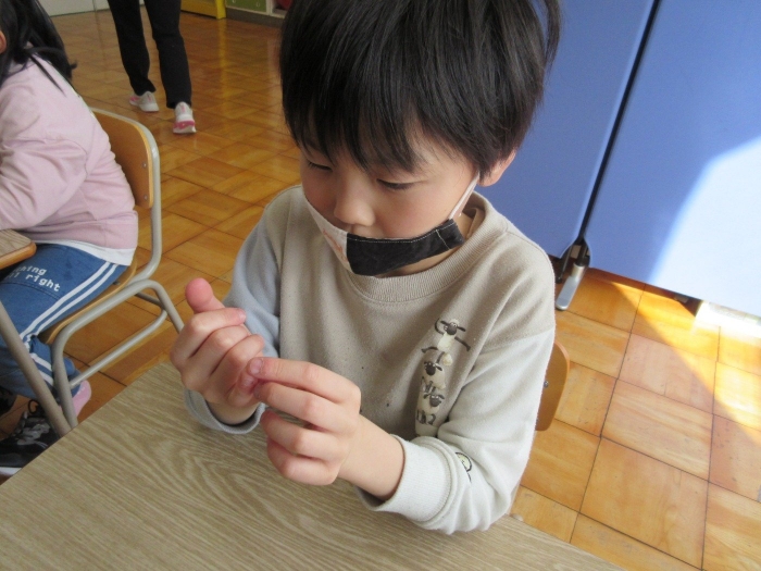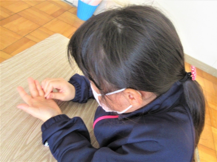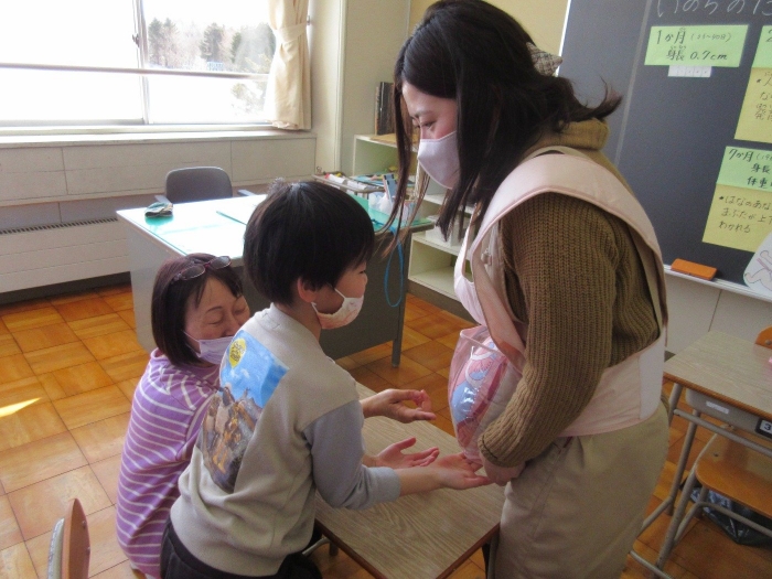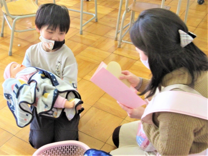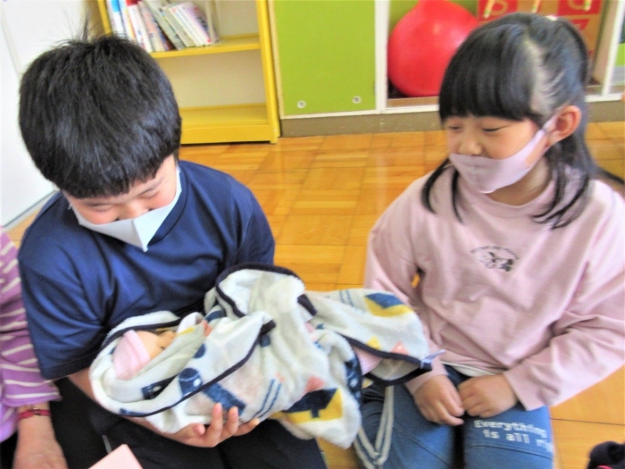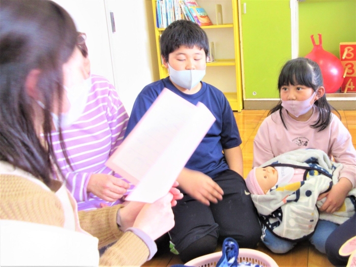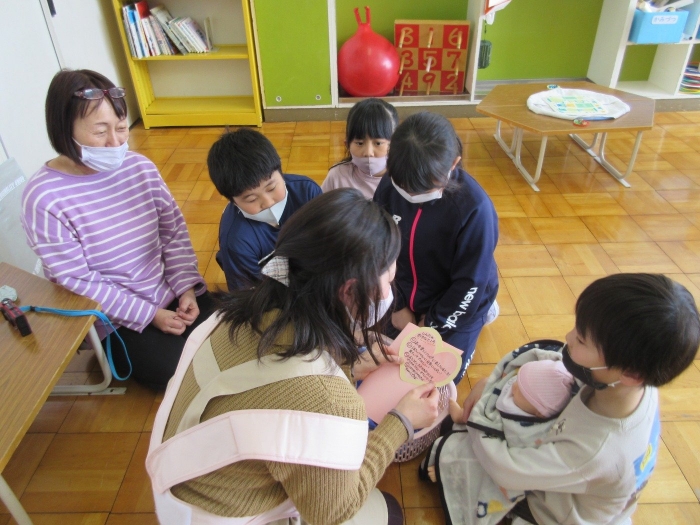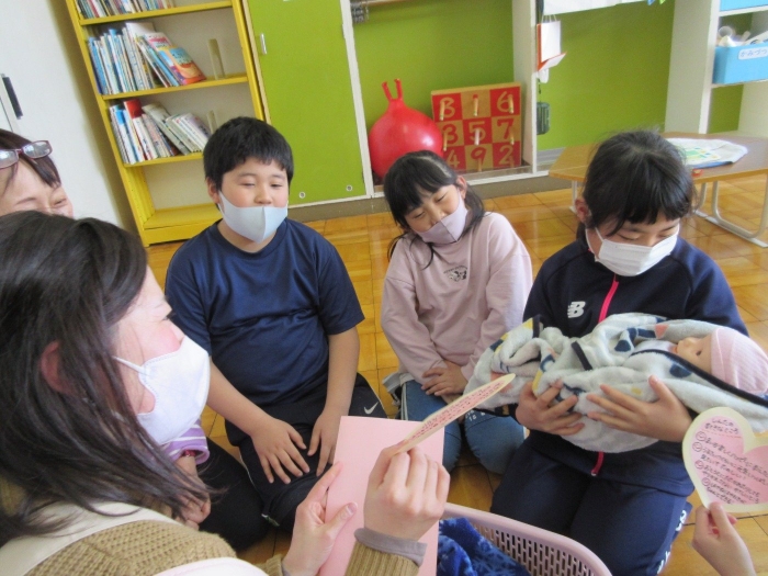 「はやくあいたいなあ・・」「バランスよく食べましょう。」「つわりでもこの子のために食べなくちゃ・・」「牛にけられないように気をつけましょう。」「いとしいな・・」事前に答えてくださったお母さん、お父さんの言葉を紹介すると、うれしそうににっこりしていました。